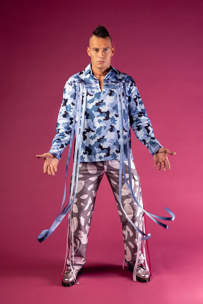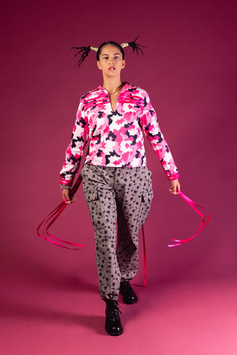 Calico & Camouflage is a fashion collection of resistance-wear defined by traditionally-inspired ribbon shirts and military-style cargo pants–two articles of clothing that are intertwined with the history of colonization on Turtle Island.