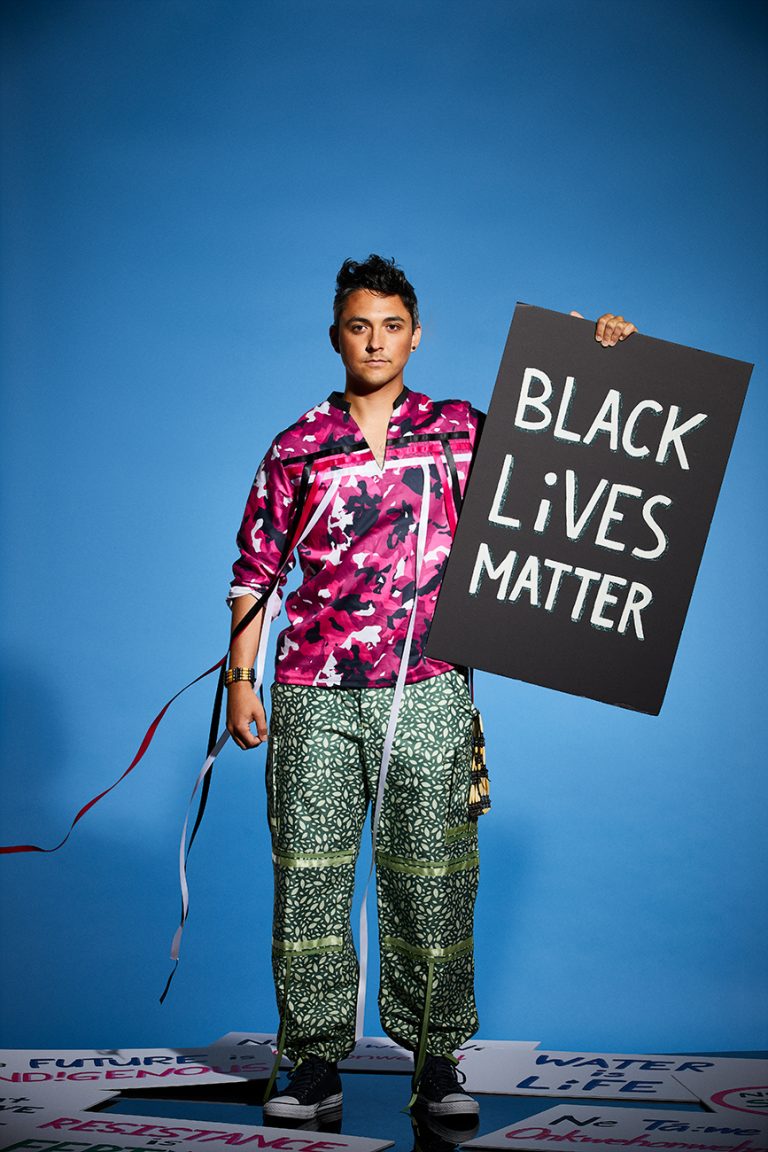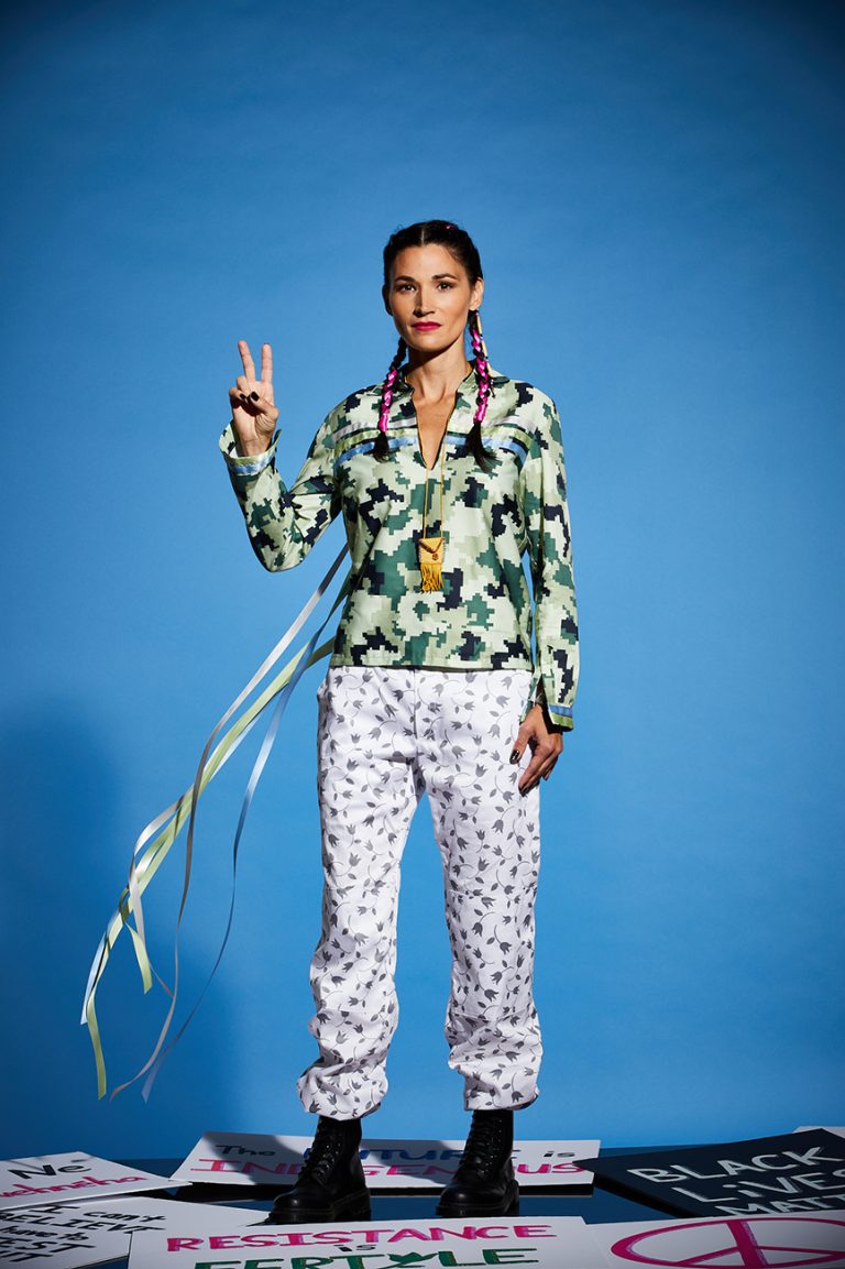 In this collection, updated and abstracted original calico and camouflage patterns are mixed and matched: camouflage ribbon shirts are paired with calico cargo pants. Powerful pink, cool blue, olive green, and gun-metal grey are the dominant colours, reflecting contemporary landscapes of activism, including demonstrations in city streets, rural roads, courtrooms and cyberspace.