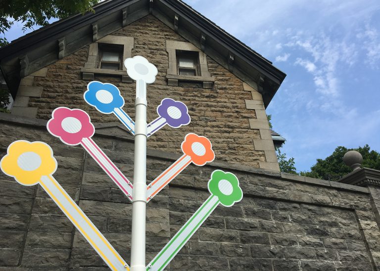 Soon after finishing the movie, I was commissioned by curator Cheryl Sim to create a public art piece for Path of Resilience, an outdoor exhibition mounted along the Promenade Fleuve-Montagne in Montreal, during the summer of 2017, the city’s 375th anniversary. Asked to make something for the urban environment that has been built upon our territory, I wondered what it would be like if our street signs were based in Haudenosaunee culture. It was clear that the Celestial Tree was a good place to start.
