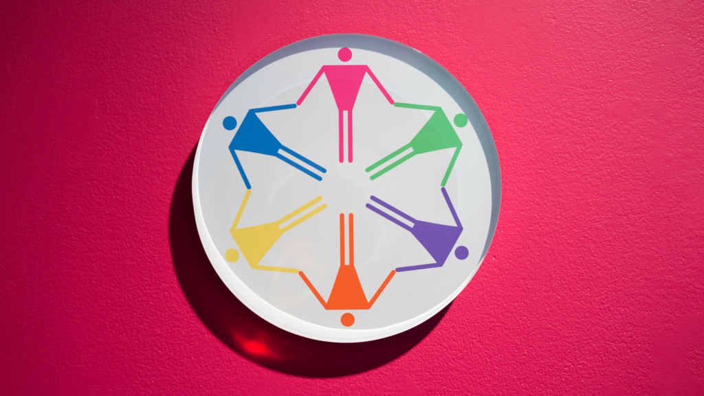 This work was originally a virtual artwork in a set for She Falls for Ages (2017). In my effort to create a world that had imagery related to Haudenosaunee culture, I of course looked towards wampum belts. The famous Friendship Belt, in which the figures hold hands, was a perfect template. In Skyworld, the people have skin that is colored either pink, blue, purple, yellow, green or orange, so the figures in Circle Wampum (2017) echo them.