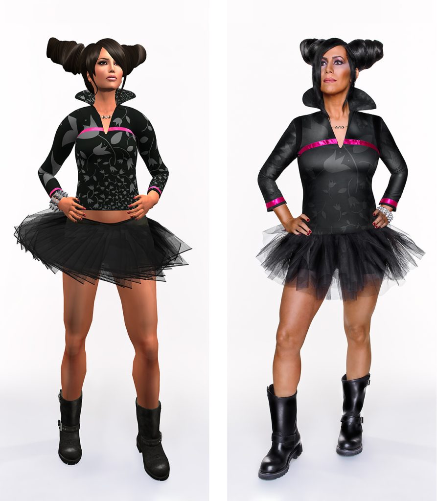 Dancing With Myself is a diptych composed of a portrait of myself and one of my avatar, xox. Through the use of fashion photography and fashion “machinimatography” (the word I use to describe the technique of taking pictures in virtual environments), this work continues my investigation of both cultural construction and our relationships with the digital world.
