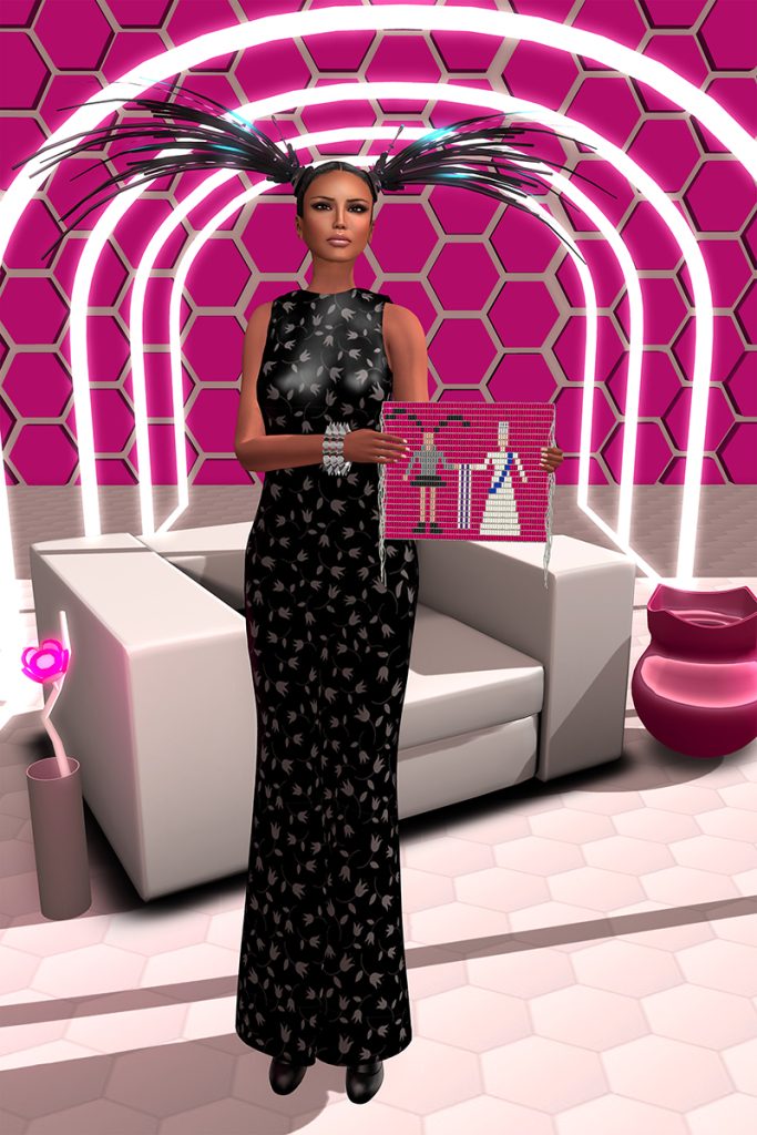 In researching royal portraits, Skawennati found many similar elements in them: the natural environment, architecture, fresh cut flowers, and very often, a single chair. They appear in Skawennati’s portrait series as well. Being from cyberspace, xox poses in an unnatural environment, a wall of glowing pink hexagons behind her. She stands inside a luminous structure that recalls a longhouse. This structure also appears in The Peacemaker Returns and it, too, was made IRL/AFK for the installation Teiakwanahstahsontéhrha’ | We Extend the Rafters | Nous tendons les perches. Her fresh flowers are the blossoms of the Celestial Tree seen in She Falls for Ages. Her chair is a slick, modern furniture statement. A pot with the distinctive mouth of ancient Iroquois clay pottery gleams in a brand-new material, mixing tradition with innovation.