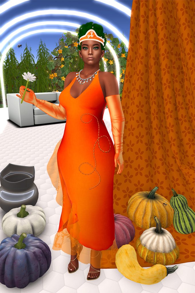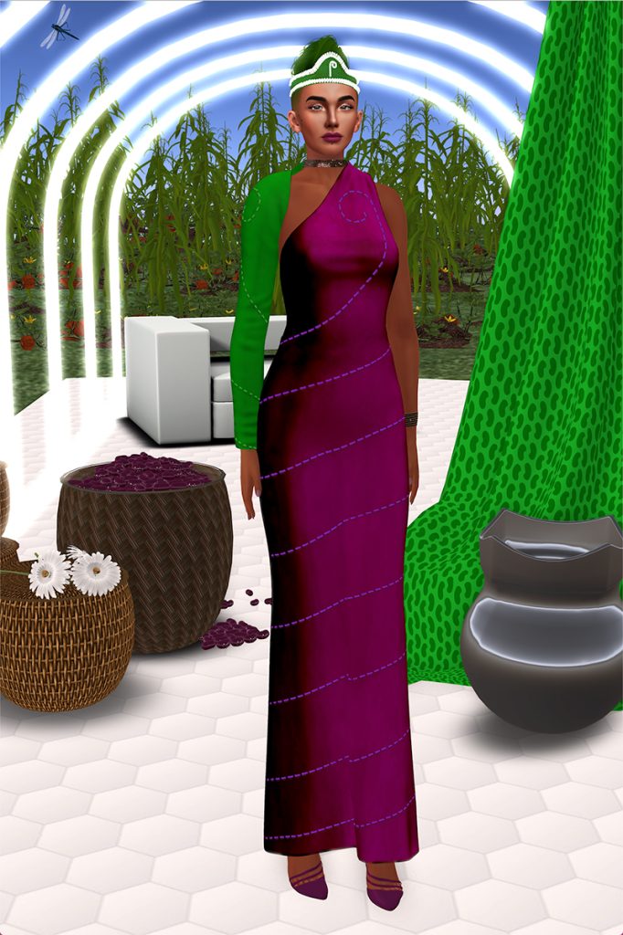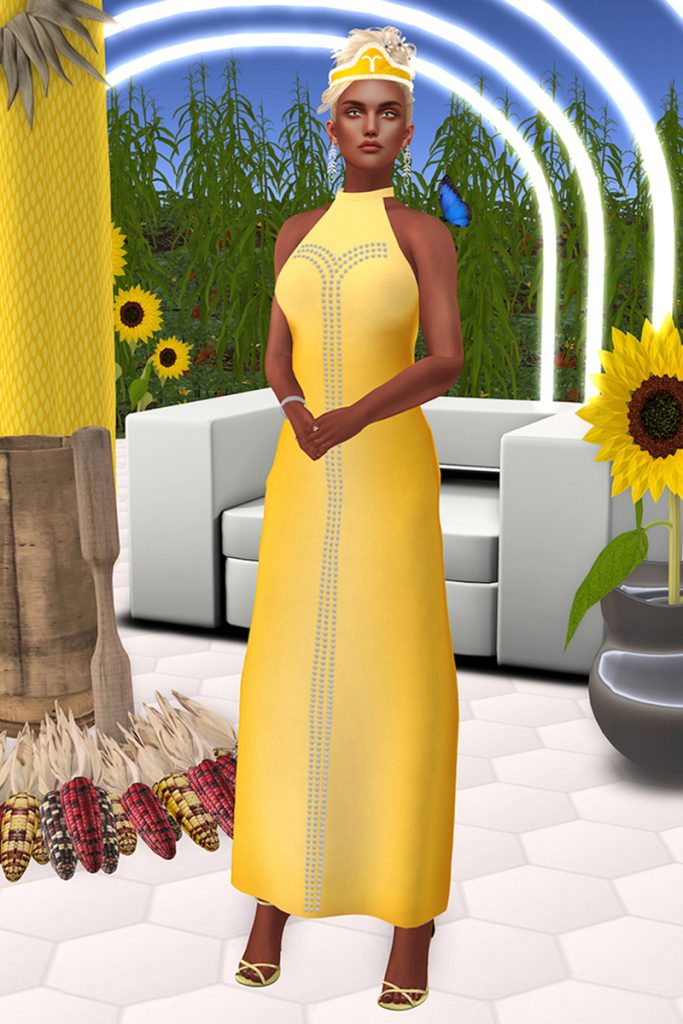Like her male counterpart, xox holds a wampum belt. Hers, however, was designed –and also made IRL/AFK– by Skawennati and depicts xox giving the Queen a famous wampum belt, known as the Two-Row. The avatar wears a gown made in the same colours and patterns as her usual ribbon shirt. The Three Sisters each wear a gown that reflects their vegetable as well as their personality. Each wears a beaded crown which many will recognize from traditional Haudenosaunee regalia, each featuring a symbol that represents their plant as a sprout.