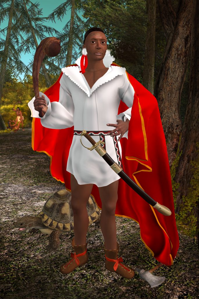 In my practice, I ask what concepts, memories and things from the past can we discard, and what do we want to bring with us into the future? These portraits represent a moment when a diplomatic relationship with the Haudenosaunee was of great importance to the Crown, so important that printed versions of the paintings were sent to North America for mass distribution. They also remind us of the adventurous spirit of our ancestors, who were unafraid to travel across the great water, visit a strange culture, and meet their leader. And they brought their culture and values with them. A Mohawk in England is still a Mohawk.