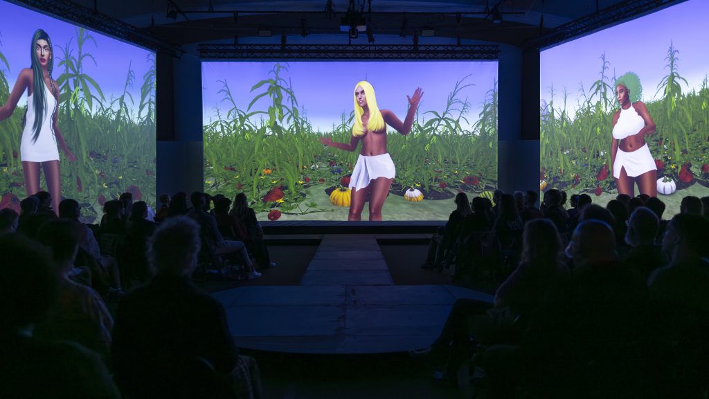 They Sustain Us tells the story of how The Three Sisters, beloved personifications of corn, beans, and squash, became superheroes. A mixed-reality performative work commissioned by Gray Area with funding from the Hewlett Foundation, it is told through two major components: a song, delivered as a 14-minute, 3-channel, machinima music video; and a fashion collection, presented in a runway show.