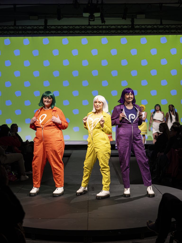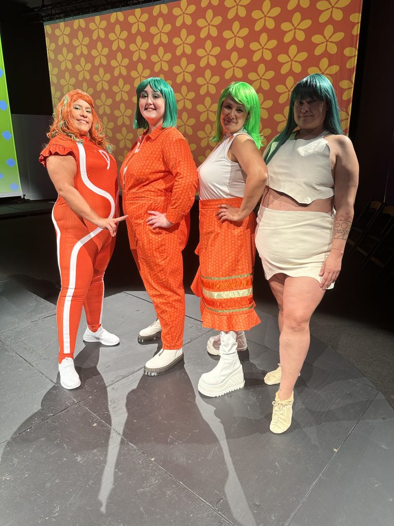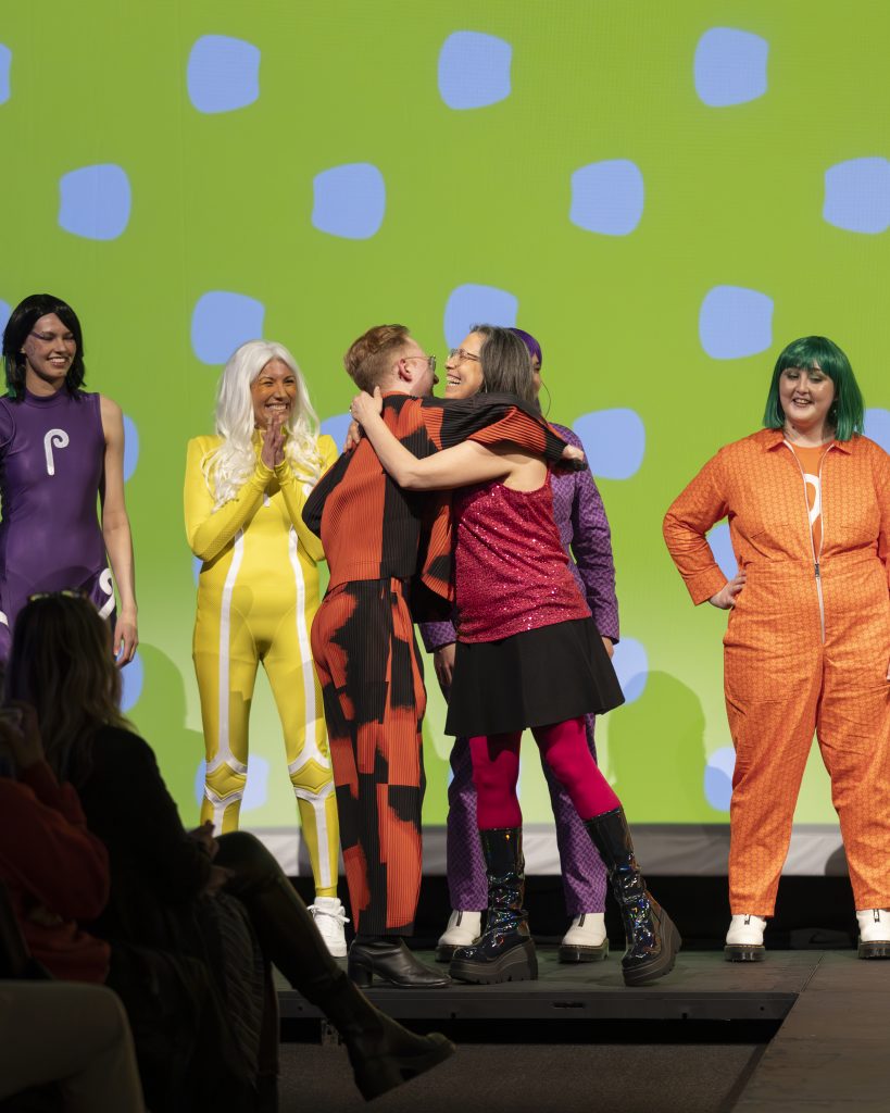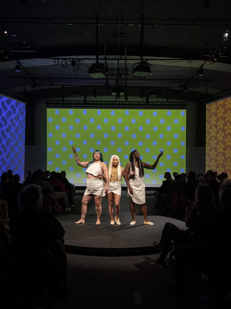 Each of the four eras are represented by a sartorial element. White deerskin is worn for Pre-contact; for Colonization, it’s ribbon skirts; flight suits are worn for Genetic Modification, nodding to both Rosie the Riveter and coveralls that might be worn in a science lab. And for Five Minutes in the Future, The Three Sisters wear, naturally, superhero suits.