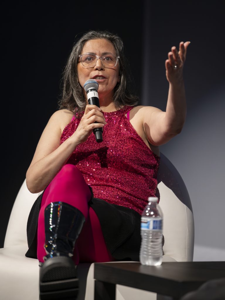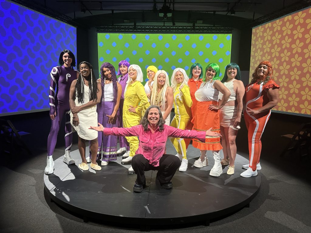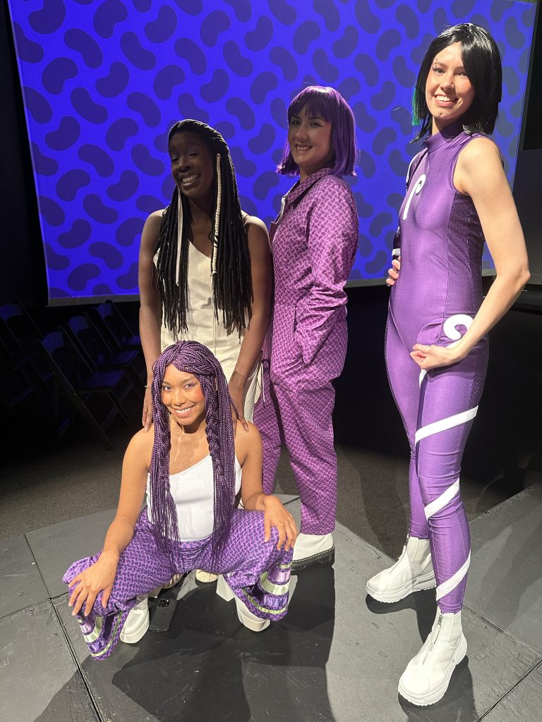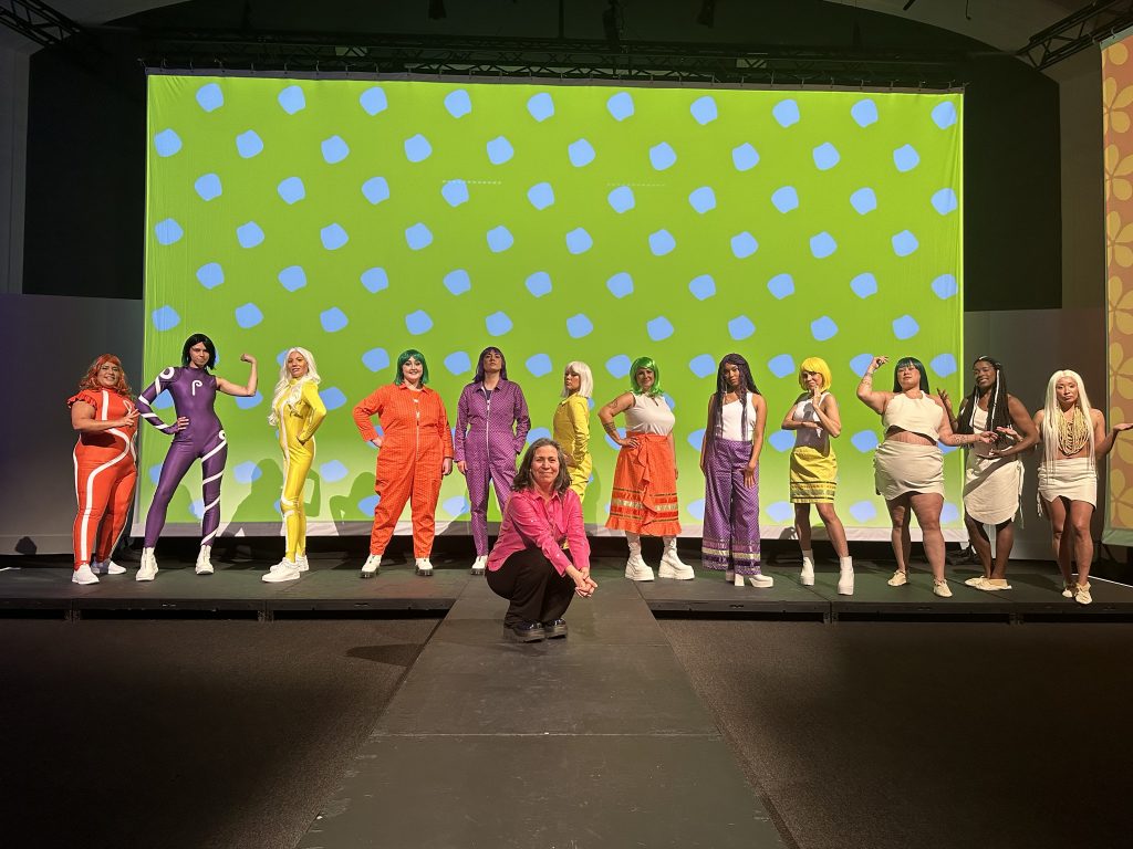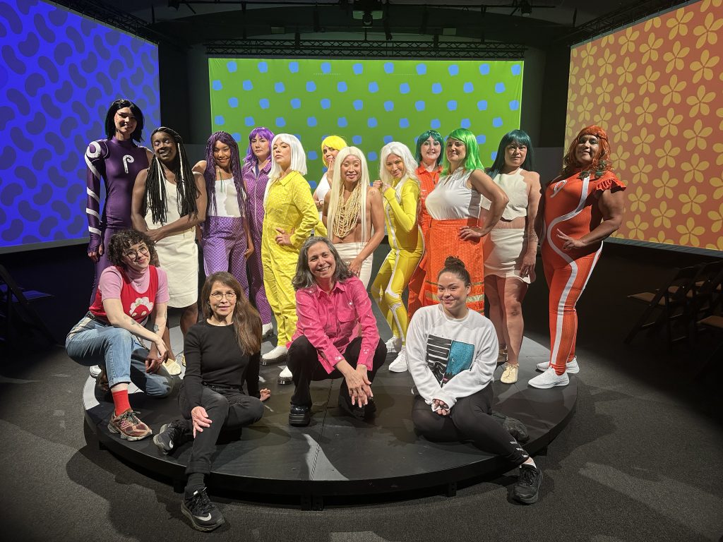 Each of the four eras are represented by a sartorial element. White deerskin is worn for Pre-contact; for Colonization, it’s ribbon skirts; flight suits are worn for Genetic Modification, nodding to both Rosie the Riveter and coveralls that might be worn in a science lab. And for Five Minutes in the Future, The Three Sisters wear, naturally, superhero suits.